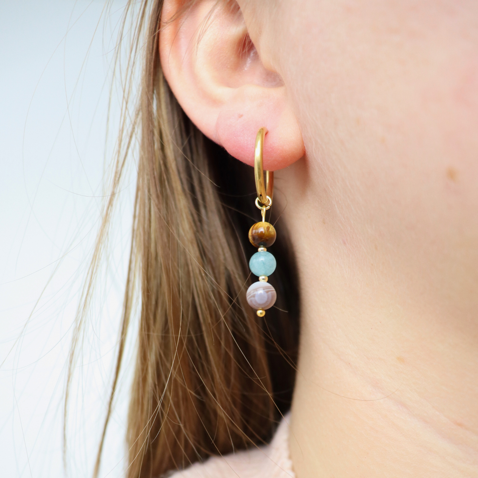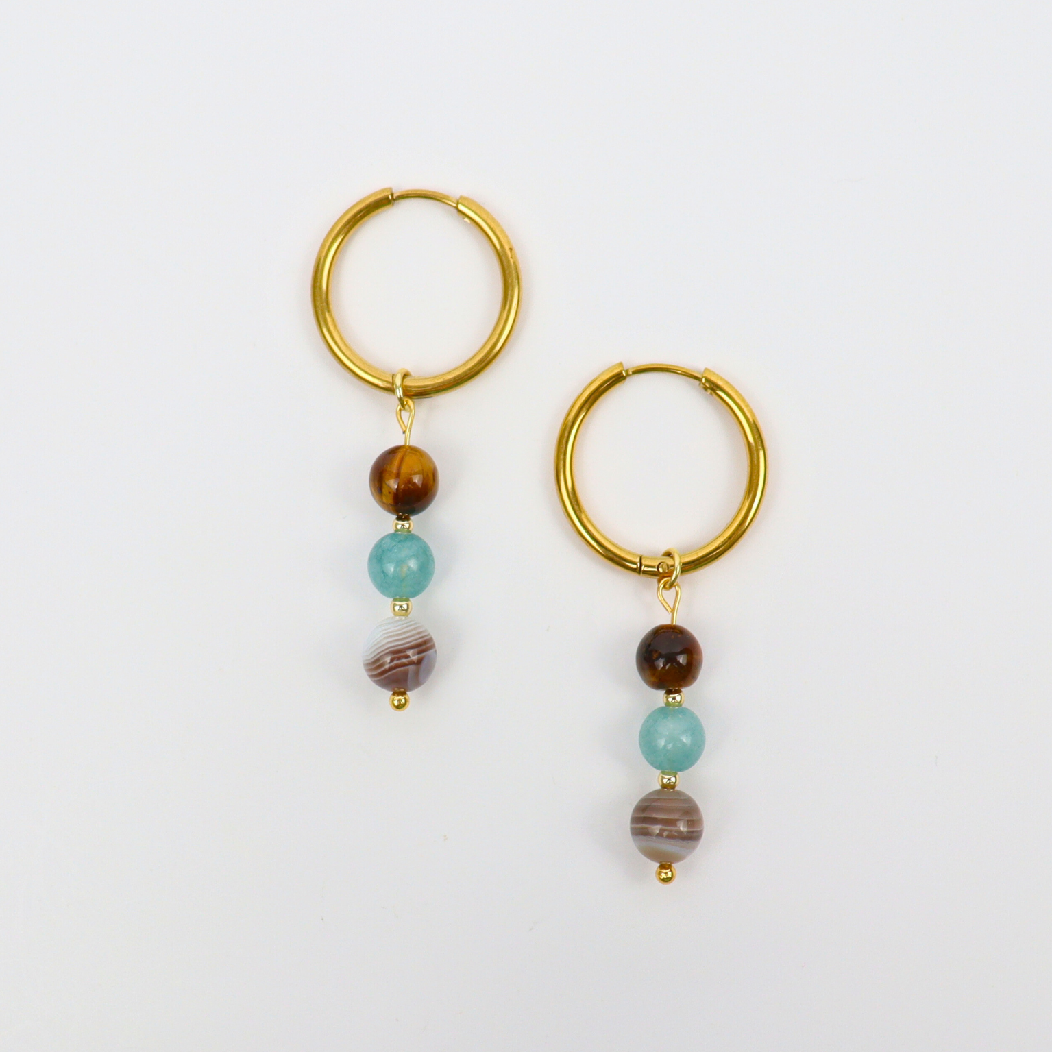Fröhlich, neugierig und kontaktfreudig – das ist die Energie des Sternzeichens Zwillinge. Diese Ohrringe sind aus vergoldetem Edelstahl gefertigt und mit drei Edelsteinen besetzt, die perfekt zu diesem Zeichen passen: Achat, Aquamarin und Tigerauge. Gemeinsam helfen Ihnen diese Edelsteine, ein Gleichgewicht zwischen Denken und Fühlen zu finden und Ihre Ideen klar auszudrücken.
