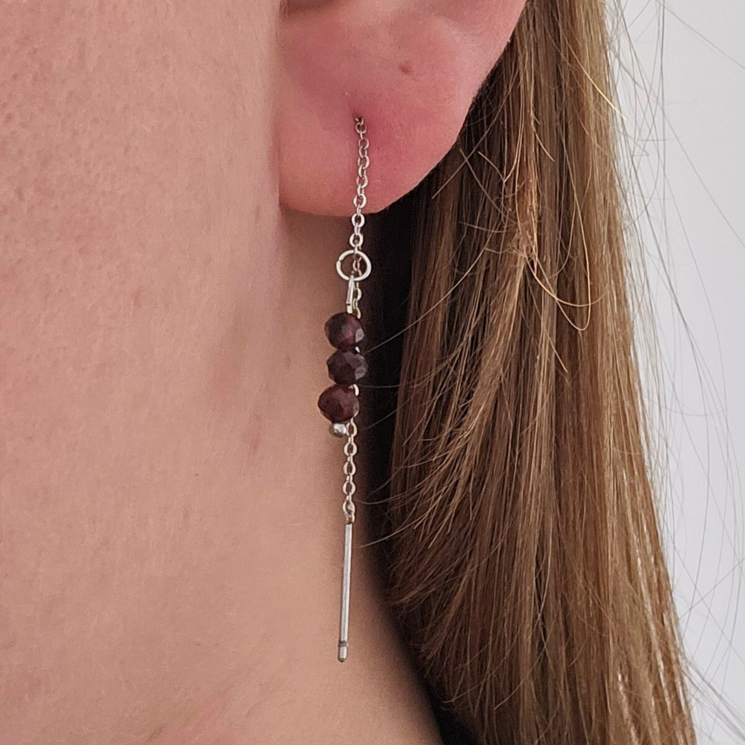 Mit diesen Ohrhängern vereinen Sie die feurige und kraftvolle Energie des Granats . Die Ohrringe aus silberfarbenem Edelstahl bestechen durch facettierte Granatsteine, die das Licht wunderschön einfangen. Tragen Sie sie einzeln für einen minimalistischen Look oder kombinieren Sie sie mit anderen Ohrringen. Granat gilt als Stein der Leidenschaft und Lebensfreude und erinnert Sie daran, das Leben in vollen Zügen zu genießen.