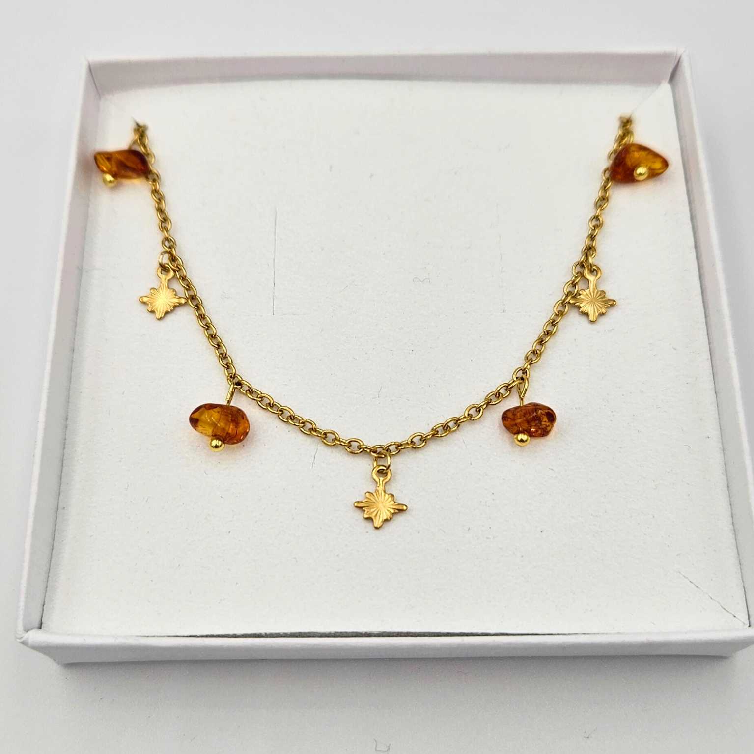 Draag de warme gloed van barnsteen met je mee met deze subtiele en speelse ketting. De ketting is gemaakt van goldplated stainless steel en afgewerkt met barnsteen steentjes, afgewisseld met stervormige bedels. Barnsteen staat bekend als de steen van rust en bescherming en helpt je negatieve energie los te laten.