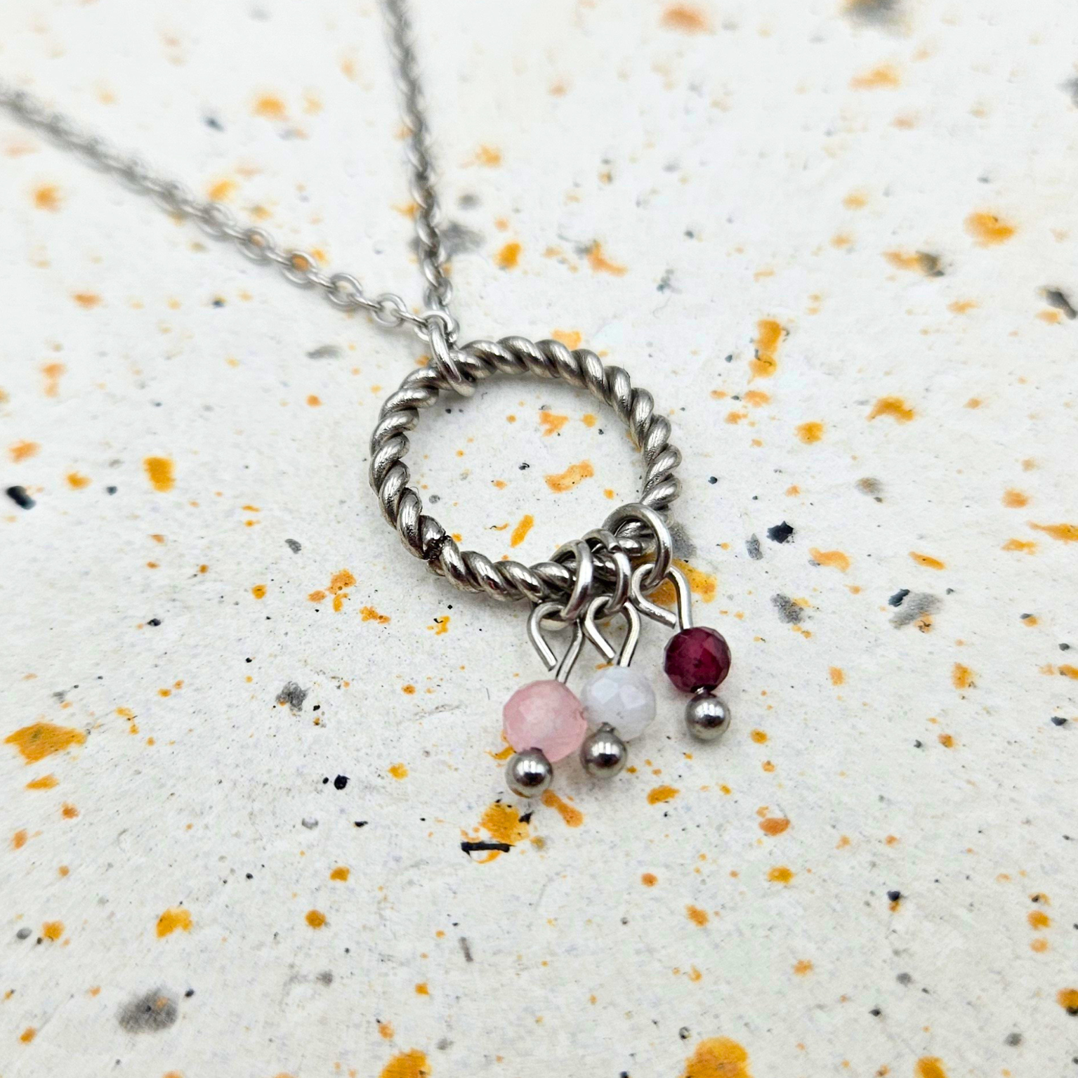 Draag een herinnering aan kracht, intuïtie en liefde dicht bij je hart met onze ketting 'kracht'. Deze prachtige ketting, gemaakt van zilverkleurig stainless steel, heeft een gedraaide ring met kleine facetgeslepen edelsteentjes – granaat, maansteen en rozenkwarts. Elk steentje heeft zijn eigen unieke kracht, samen vormen ze een krachtig symbool van kracht en doorzettingsvermogen.
