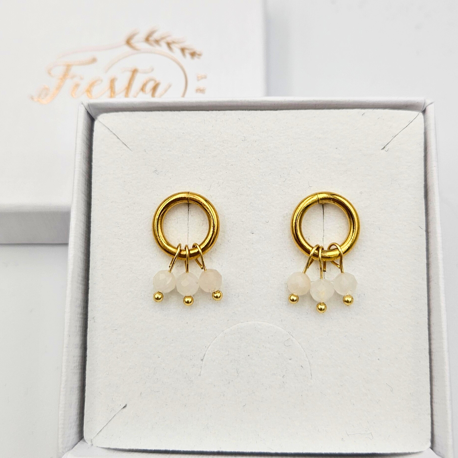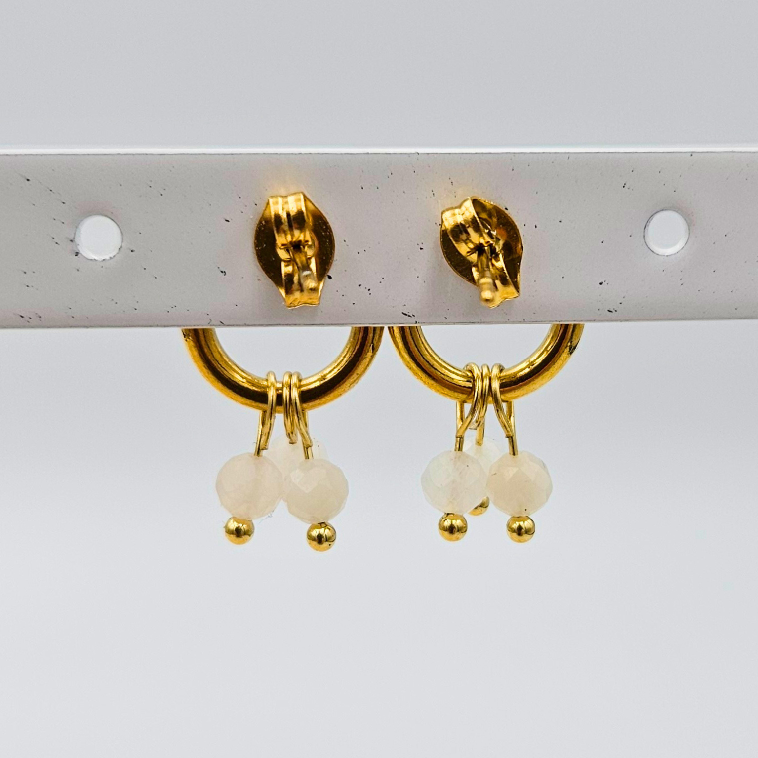 Draag de zachte en intuïtieve energie van maansteen mee met deze subtiele oorbellen. De oorbellen zijn gemaakt van een ringvormige steker van goldplated stainless steel ringen en afgewerkt met facetgeslepen maansteen steentjes die het licht prachtig opvangen. Maansteen staat bekend als de steen van vrouwelijke energie en innerlijke rust en herinnert je eraan om in contact te blijven met je gevoel.