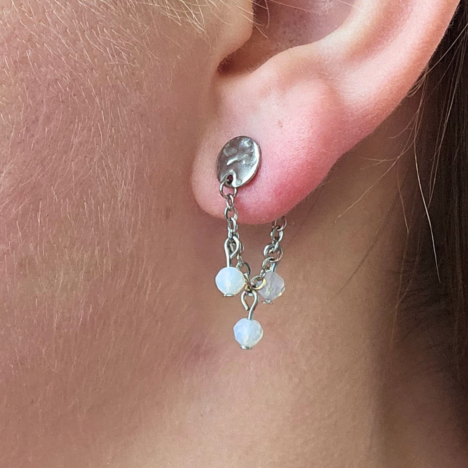 Draag de zachte en kalme energie van opaliet mee met deze sierlijke oorbellen. De oorbellen zijn gemaakt van een gehamerde steker van zilverkleurig stainless steel en 3 opaliet steentjes die het licht prachtig vangen. Opaliet staat bekend als de steen van helderheid en emotionele balans en herinnert je eraan om met vertrouwen je hart te volgen.