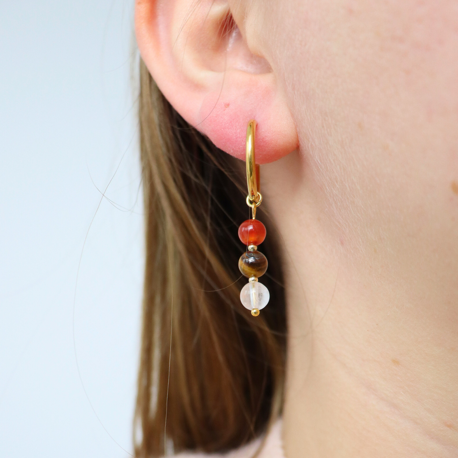 Stralend, warm en vol levenslust: de energie van sterrenbeeld leeuw is niet te missen. Deze oorbellen zijn gemaakt van goldplated stainless steel en drie edelstenen die perfect passen bij dit sterrenbeeld: carneool, bergkristal en tijgeroog. Samen weerspiegelen deze edelstenen jouw natuurlijke kracht en enthousiasme.