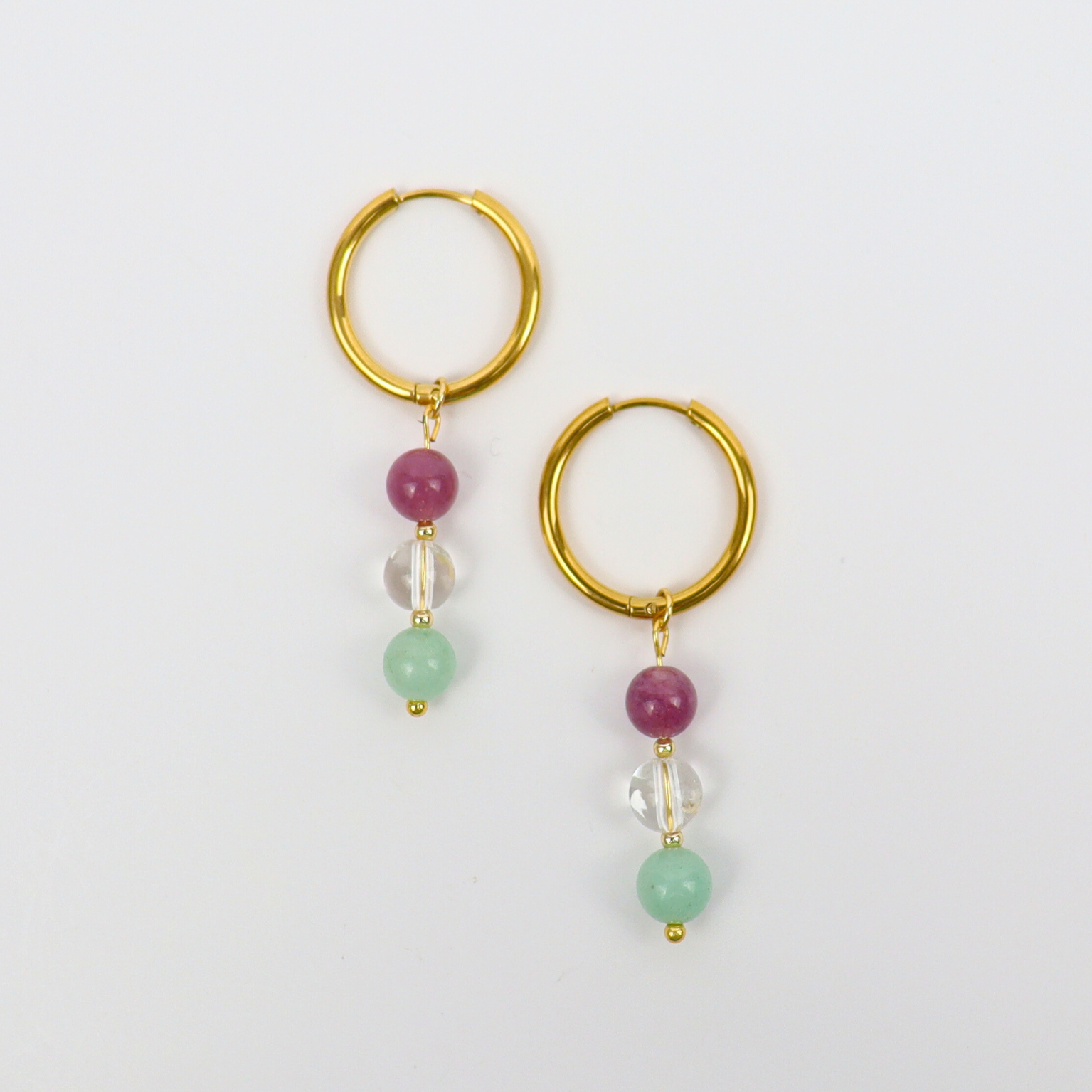 Nuchter, zorgzaam en betrouwbaar, dat is precies wat het sterrenbeeld maagd kenmerkt. Deze oorbellen zijn gemaakt van goldplated stainless steel en drie edelstenen die perfect passen bij dit sterrenbeeld: lepidoliet, bergkristal en amazoniet. Samen helpen deze edelstenen je kalm te blijven en je gedachten te ordenen.