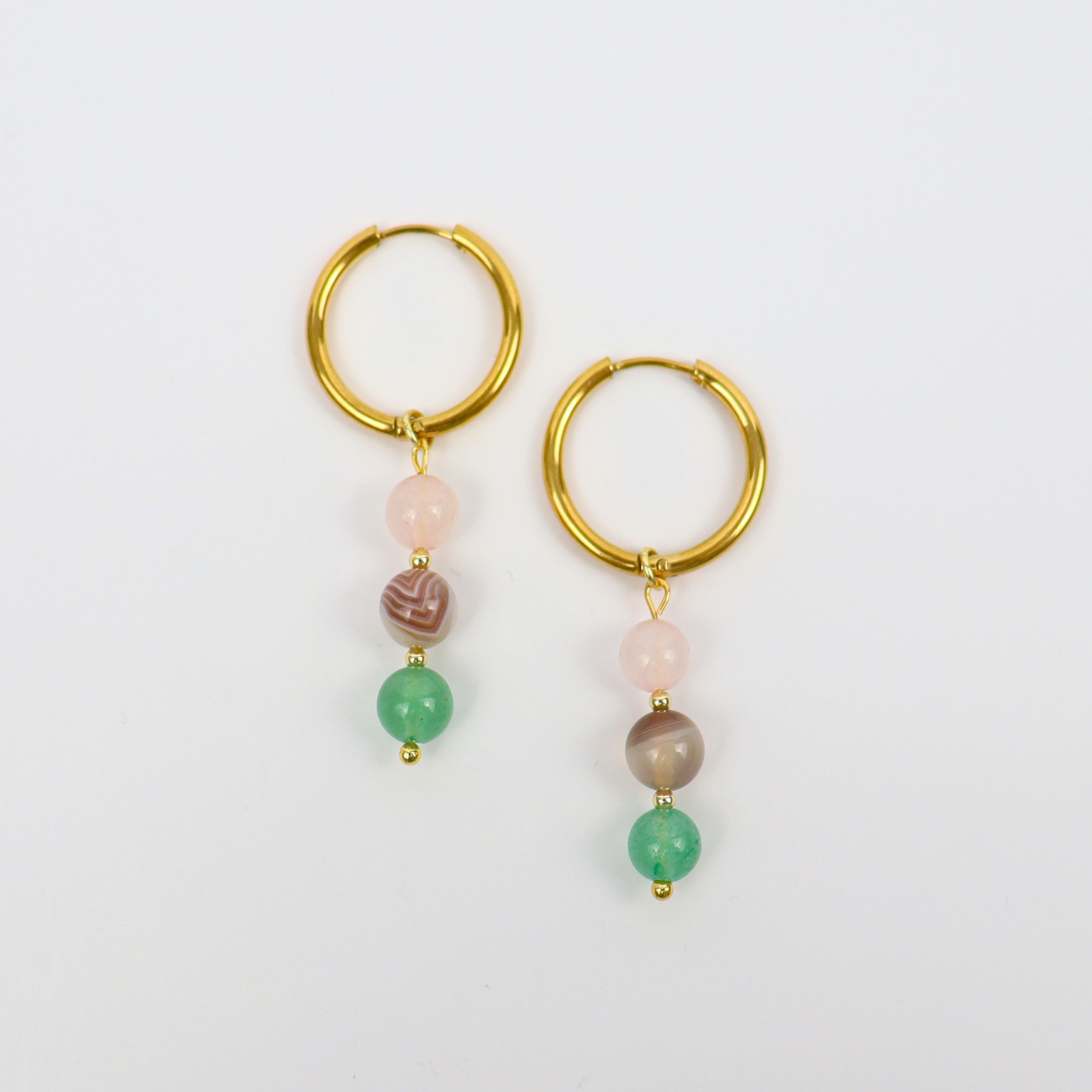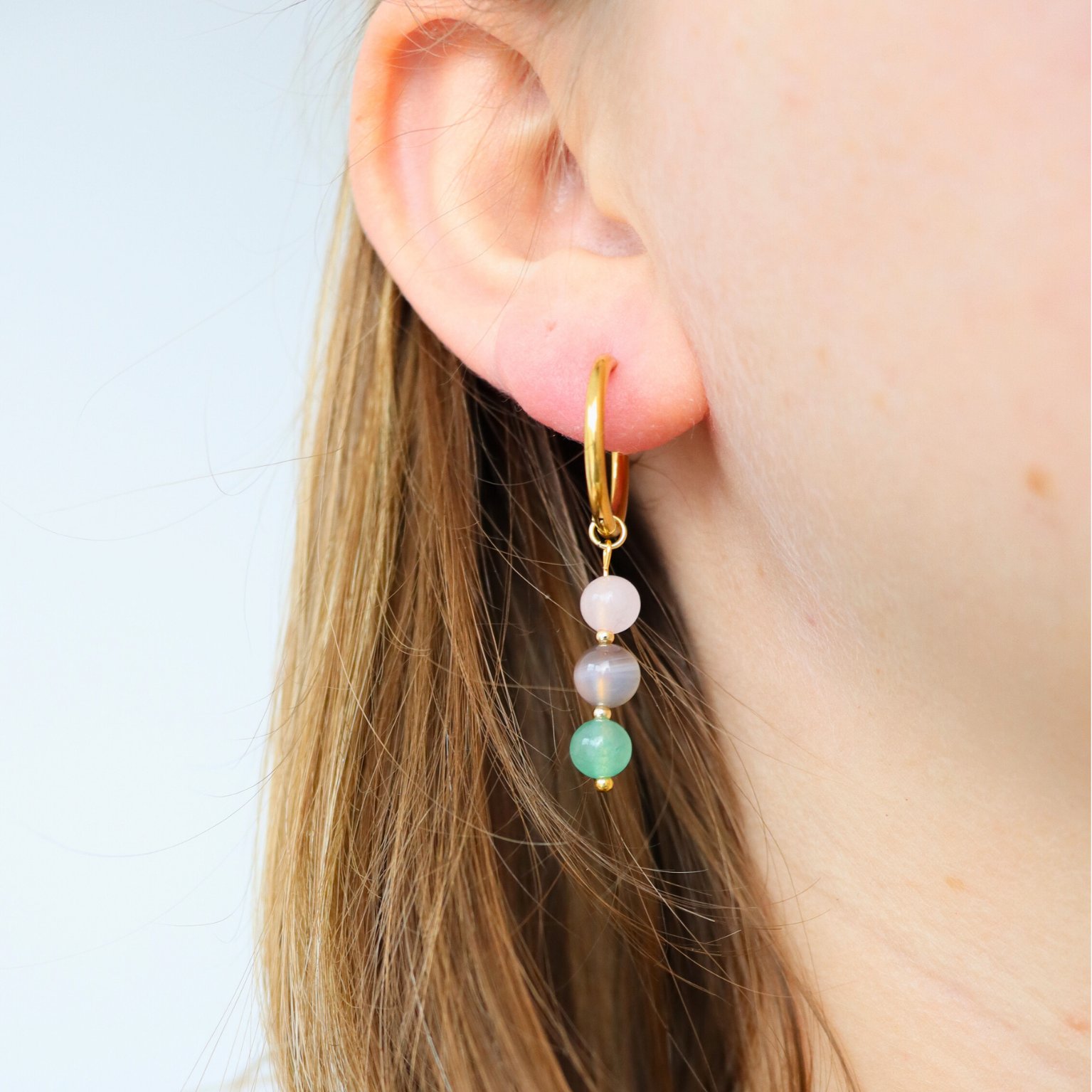 Draag een herinnering aan de zachte, aardse energie van stier dagelijks met je mee. Deze oorbellen zijn gemaakt van goldplated stainless steel en drie edelstenen die perfect passen bij dit sterrenbeeld: rozenkwarts, aventurijn en agaat. Samen brengen ze rust, liefde en stabiliteit, precies wat bij de stier past.