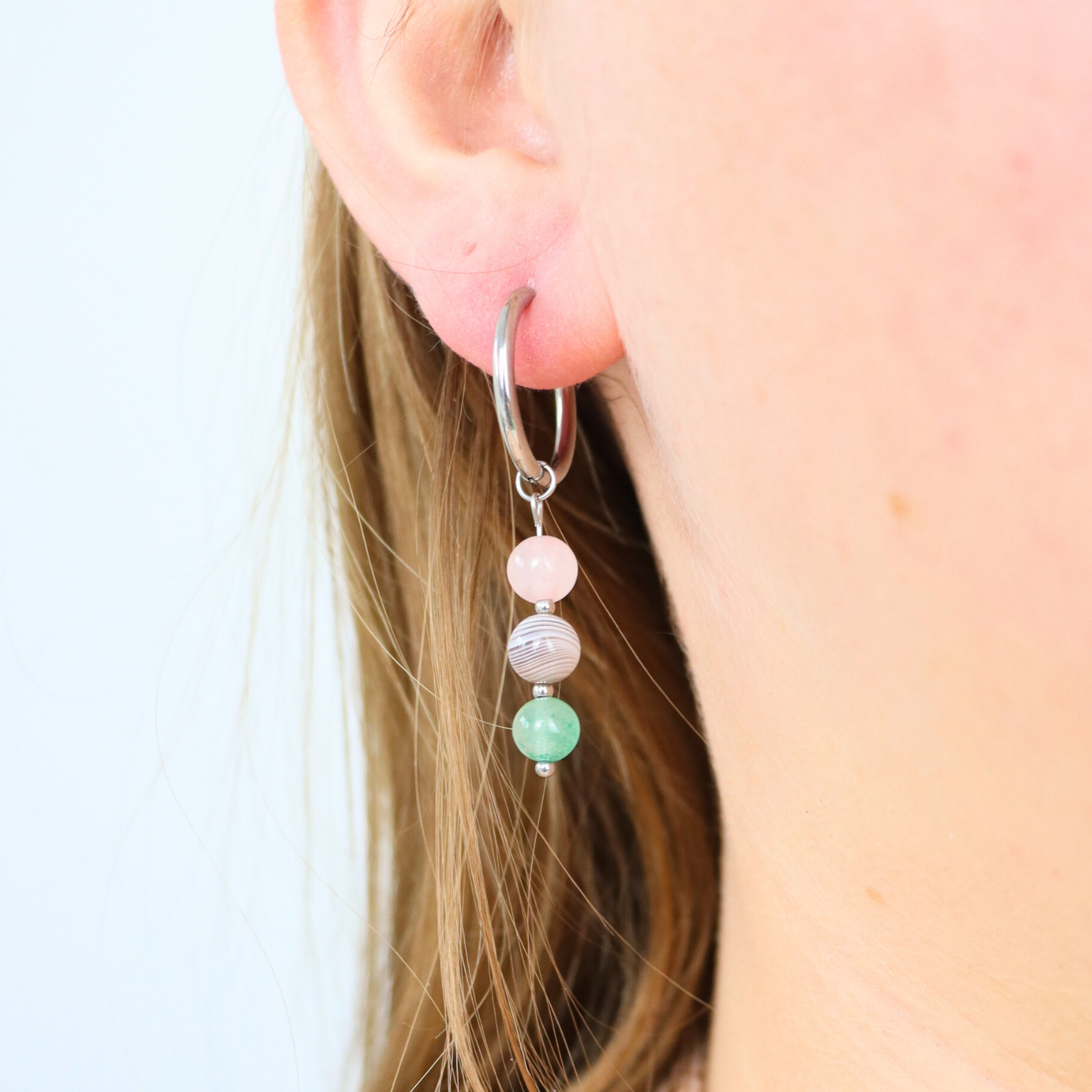 Draag een herinnering aan de zachte, aardse energie van stier dagelijks met je mee. Deze oorbellen zijn gemaakt van zilverkleurig stainless steel en drie edelstenen die perfect passen bij dit sterrenbeeld: rozenkwarts, aventurijn en agaat. Samen brengen ze rust, liefde en stabiliteit, precies wat bij de stier past.