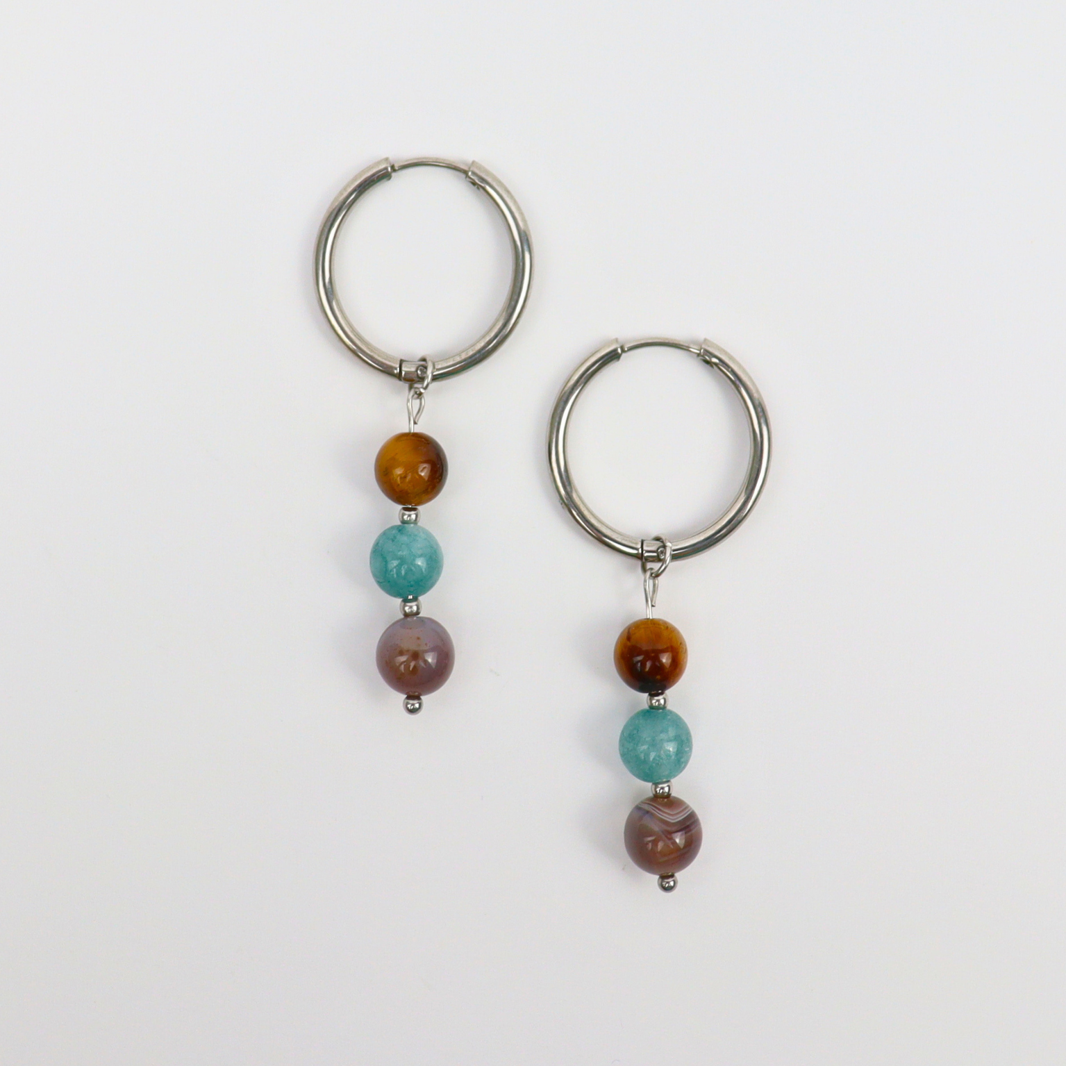 Vrolijk, nieuwsgierig en sociaal, dat is de energie van het sterrenbeeld tweelingen. Deze oorbellen zijn gemaakt van zilverkleurig stainless steel en drie edelstenen die perfect passen bij dit sterrenbeeld: agaat, aquamarijn en tijgeroog. Samen helpen deze edelstenen je om balans te vinden tussen denken en voelen, en om je ideeën helder te verwoorden.